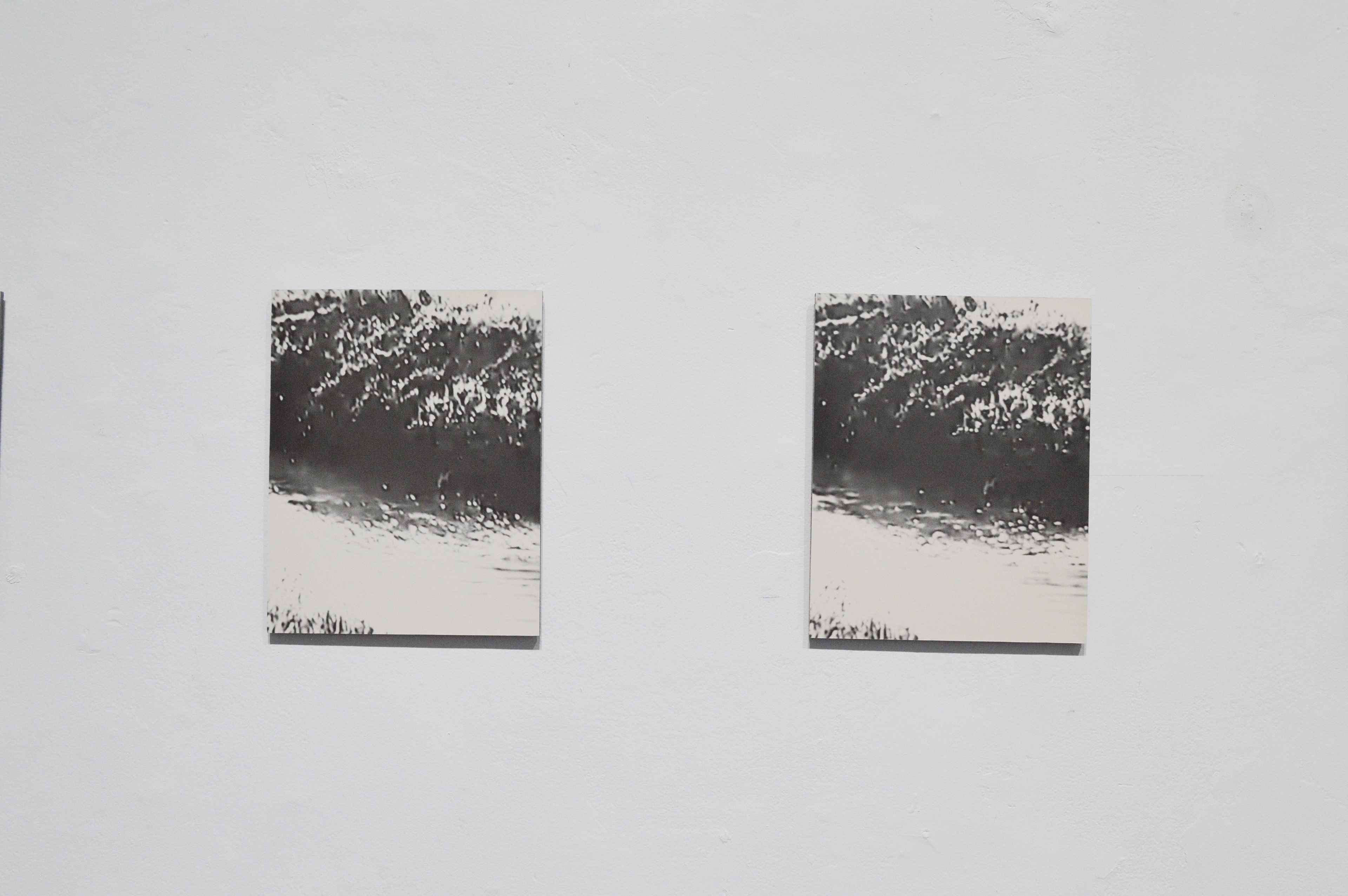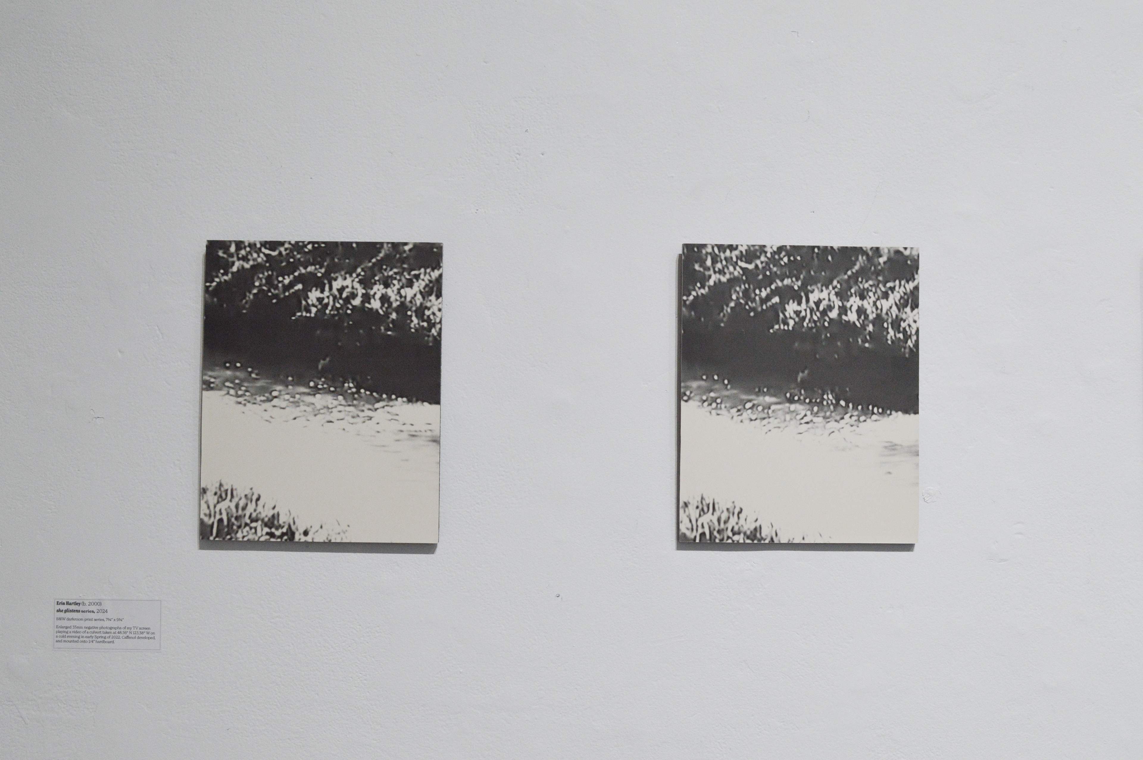 Enlarged 35mm negative photographs of my TV screen playing a video of a culvert taken at 48.56° N 123.38° W on a cold evening in early Spring of 2022. Caffenol developed, and mounted onto 1/4” hardboard.